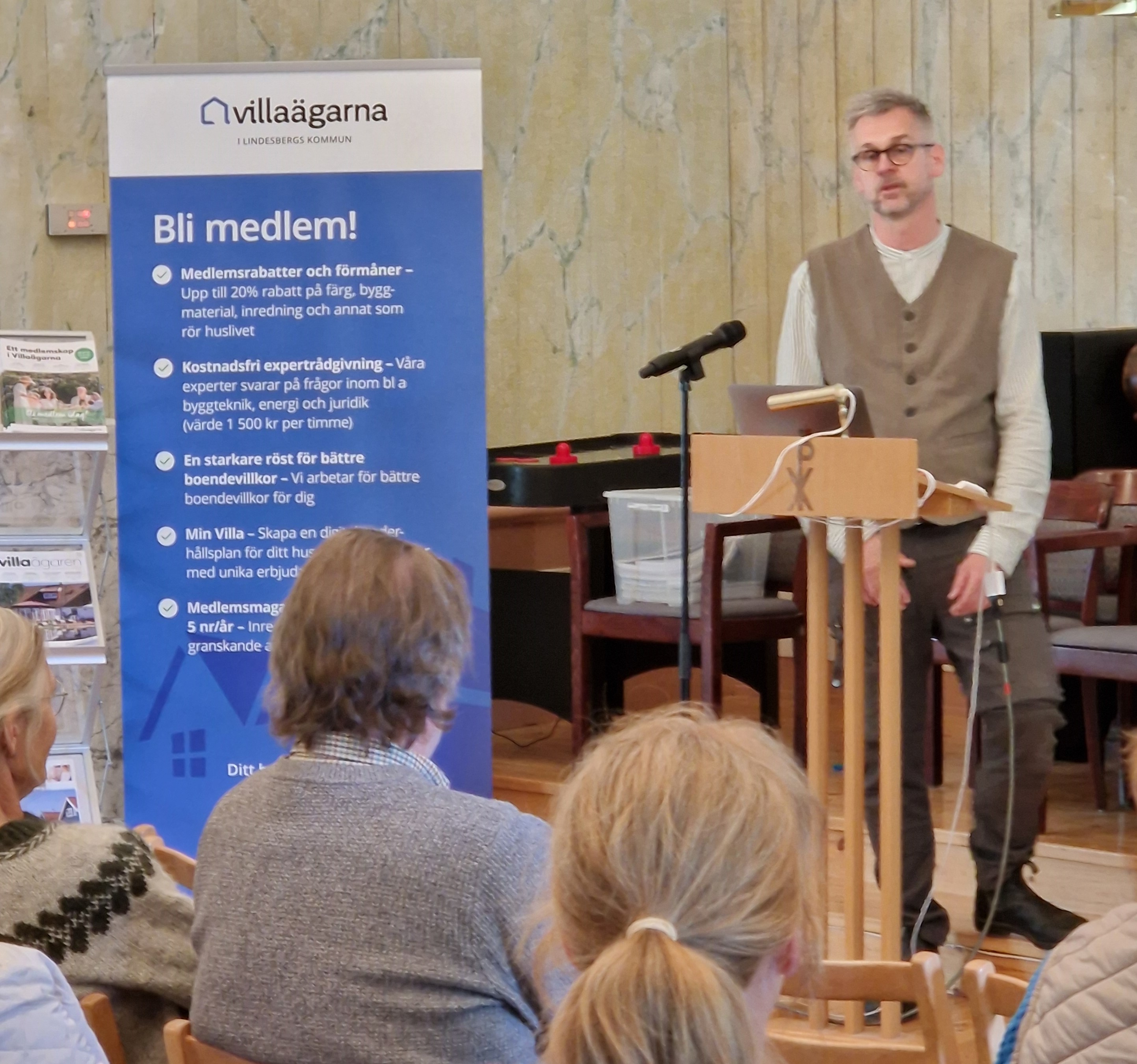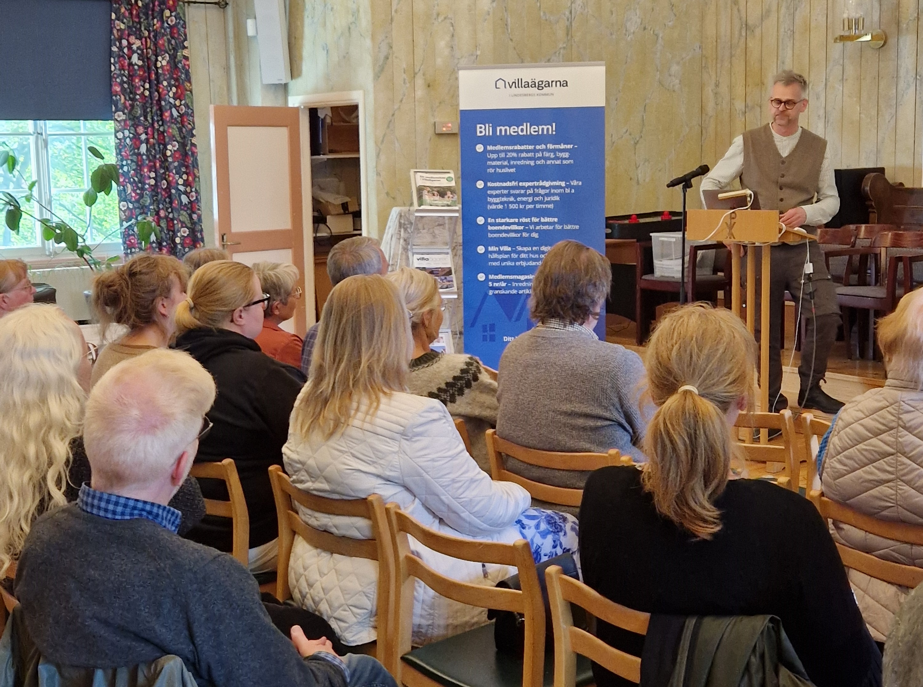 Gert Forberg Villaägarna Bergslagen hälsade alla välkomna och berättade att det var Villaägarna Bergslagen som arrangerade informationsträffarna med Farbror Grön, med hjälp av Leader Bergslagen.