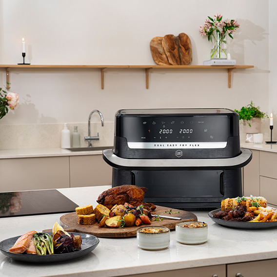 Upptäck mångsidigheten och enkelheten med Flex Dual Easy Fry från OBH Nordica, en avancerad air fryer som förändrar ditt sätt att laga mat. Tack vare den smarta FlexCook-dividern kan du enkelt växla mellan två oberoende matlagningszoner (5,5L + 3,5L) och en stor GiantZone (9L). Använd GiantZone för att laga stora livsmedel för upp till åtta portioner, eller skapa två zoner för att tillaga separata ingredienser med individuella tids- och temperaturkontroller. Den har även ett fönster så att du kan kolla till maten utan att behöva öppna air fryern och släppa ut värmen.